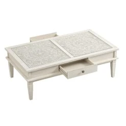 - With its whitewashed finish wooden surfaces and floral pattern carved table top, our Chantilly coffee table will be a practical and beautiful focal point in the living room.