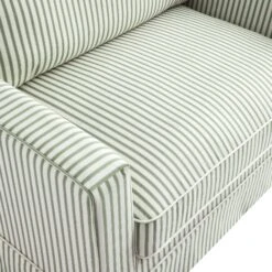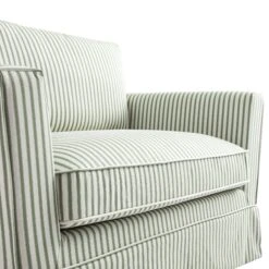 - Upholstered in a soft linen-blend fabric with classic sage green and ivory ticking stripes, it adds a gentle rhythm to any room—elegant without trying too hard, and effortlessly soothing to the eye.